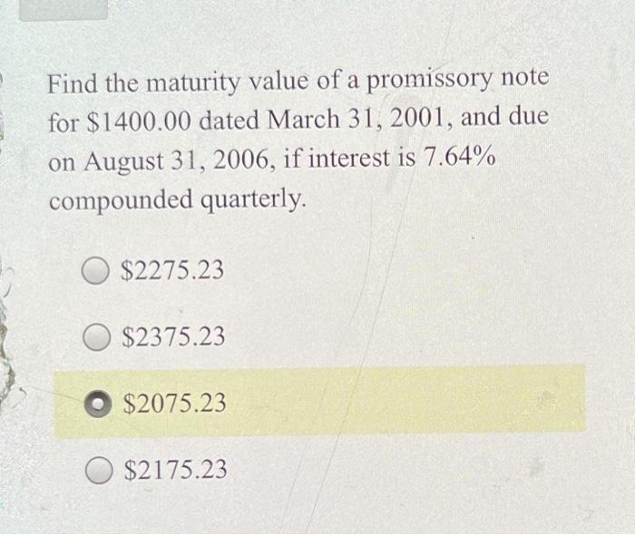 A promissory note with a maturity value of 700 is sold at a discount rate of 8 45 days before maturity. A promissory note for a loan with a term of usually less than 1 year. Use the future value formula to compute the maturity value of the following promissory note.